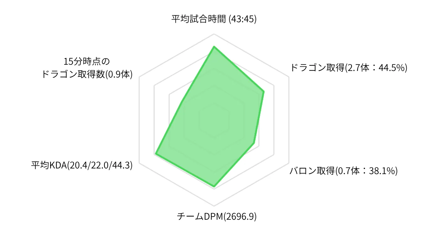 | ・全試合TOPリサンドラと意表を突くPICK ・序盤から全レーン主導権があり、後半もムンドやADCのスケールがある ・平均KDAが高く、集団戦のクオリティが高い ・序盤のドラゴンには消極的で、中盤以降に有利を築いてからオブジェクを狙う傾向 | ||
