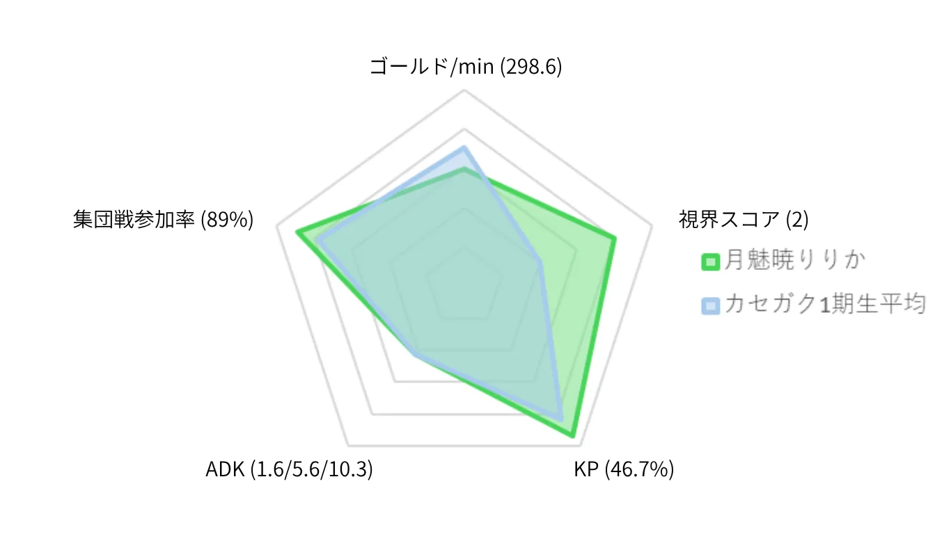 | ・金銭面やダメージ面、キルアクションどれを見ても優秀 ・特にキル関与率が高いことから、TOPレーン有利を集団戦で還元できている ・現在プラチナ3のため、卒業が確定 | |