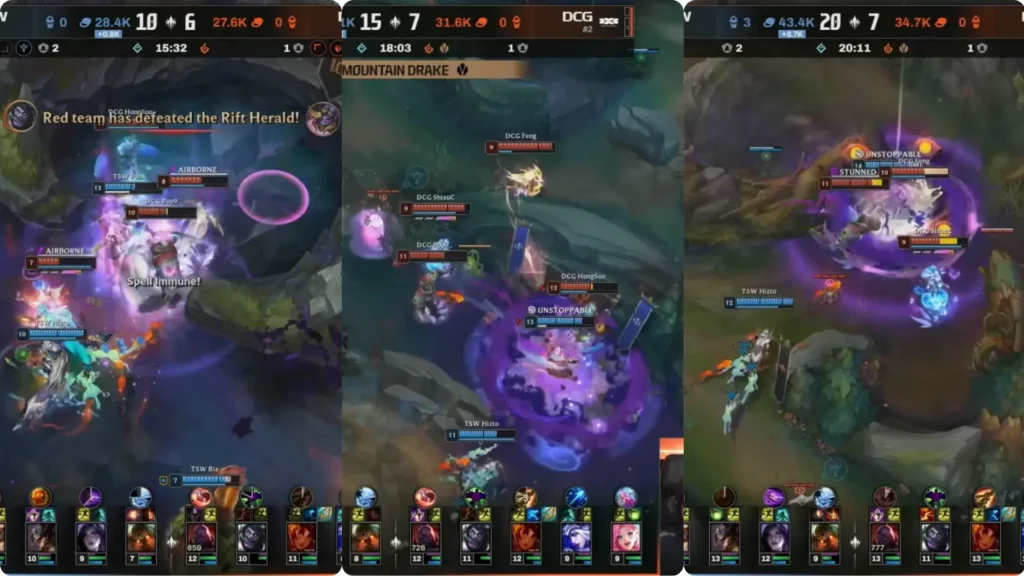 続くドラゴンファイトでも、セトは止まりません。今度はアルティメットでDCGのタリヤを落とし、TSWが再びACEを獲得。さらに20分のバロン前でも、セトがムンドをアッシュとセラフィーンにぶつける形で一気に崩し、そのまま4キルを回収します。