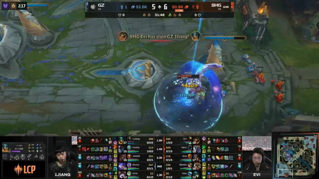 そして試合終盤、勝負を決定づけたのはSHGの判断力でした。バロン前でにらみ合いが続く中、Evi選手がBOTのインヒビタータワー付近でGZのオラフをソロキルです。このプレーによってGZはバロン前での集団戦を強いられる形になり、その隙を逃さなかったSHGが一気にネクサスを破壊。見事に勝利をつかみ取りました。