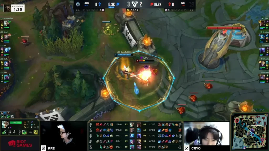 LGG側はエンゲージ手段が乏しく、自分から集団戦を仕掛けるのが難しい構成でした。一方でNX側は、グウェンとライズのスケールに加えて、エズリアルのポークでにらみ合いも強く、レイトゲームまで行けば構成的に勝ちやすい形です。つまり、LGGがどこまで早い時間帯に崩せるか、NXがどこまで受け切ってスケールに持ち込めるかが焦点でした。