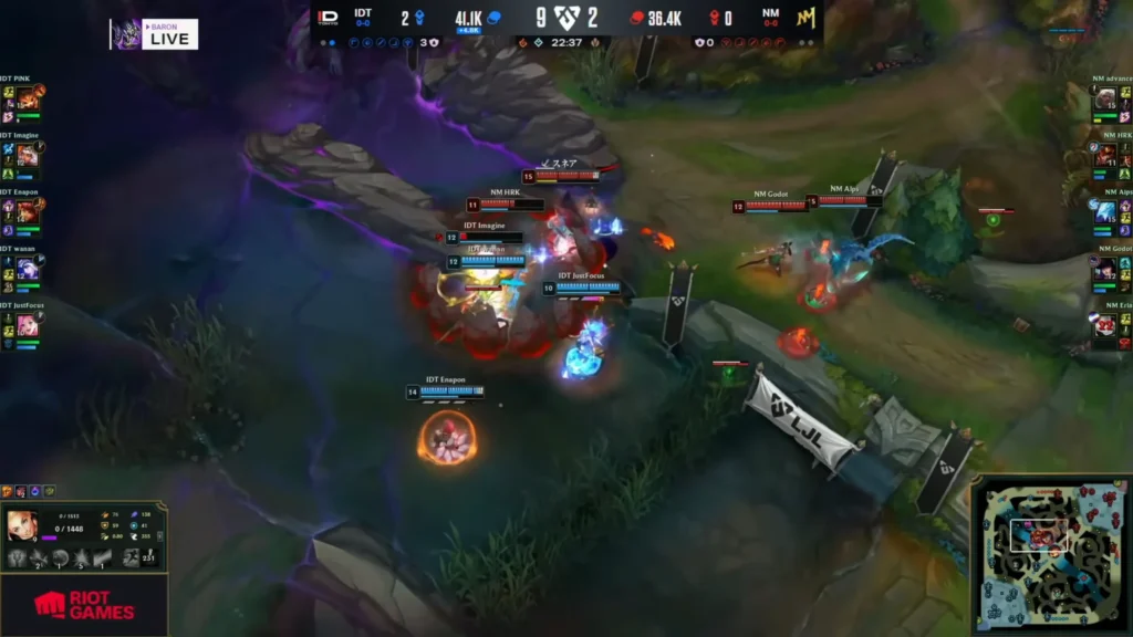 ただ、バロン前の集団戦でIDTがNMのMIDとSUPをキャッチし、一度は人数差をつけましたが、そこからNMが冷静に返し、ACEを獲得して一気に金額差を縮めました。IDT側はパッシブを持つアニビアとラックスにリソースを使いすぎてしまい、その後のNMの切り返しに対して、十分に対応できなかった形です。