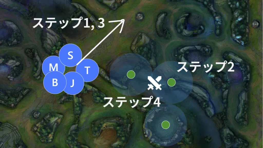 ステップ2は、視界を確保することです。リバーのIブッシュ、Cブッシュ、ドラゴンピット内の順に視界を押さえます。この時のポイントは、タンクが先頭に立ってリバーやブッシュへ入っていくことです。柔らかいチャンピオンが先に入ると、見えない場所から捕まって一気に崩れやすくなります。