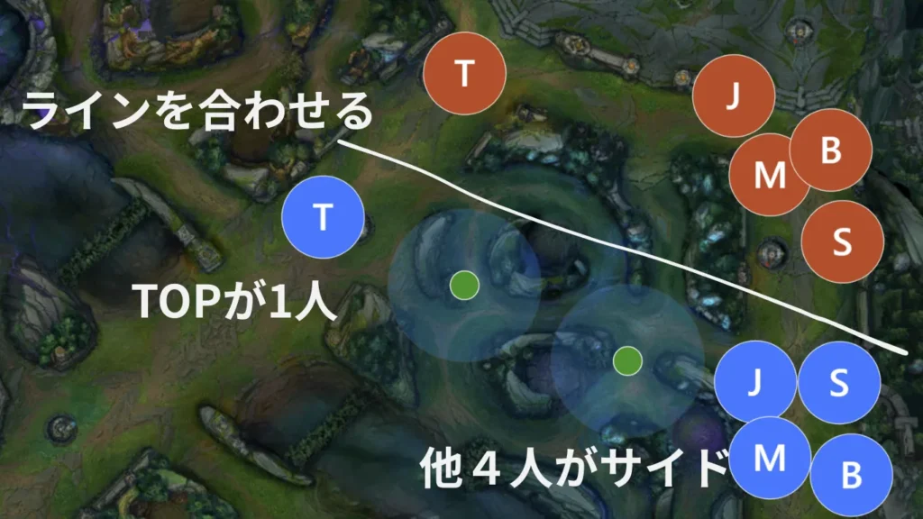 分かれ方は、TOPレーナーなどの比較的硬いチャンピオンがMIDで1人になり、残り4人がTOPかBOTのどちらかを4人で押す形が安全です。サイド側にADCやメイジを置くのは、相手が仕掛けられる方向を限定できるからです。